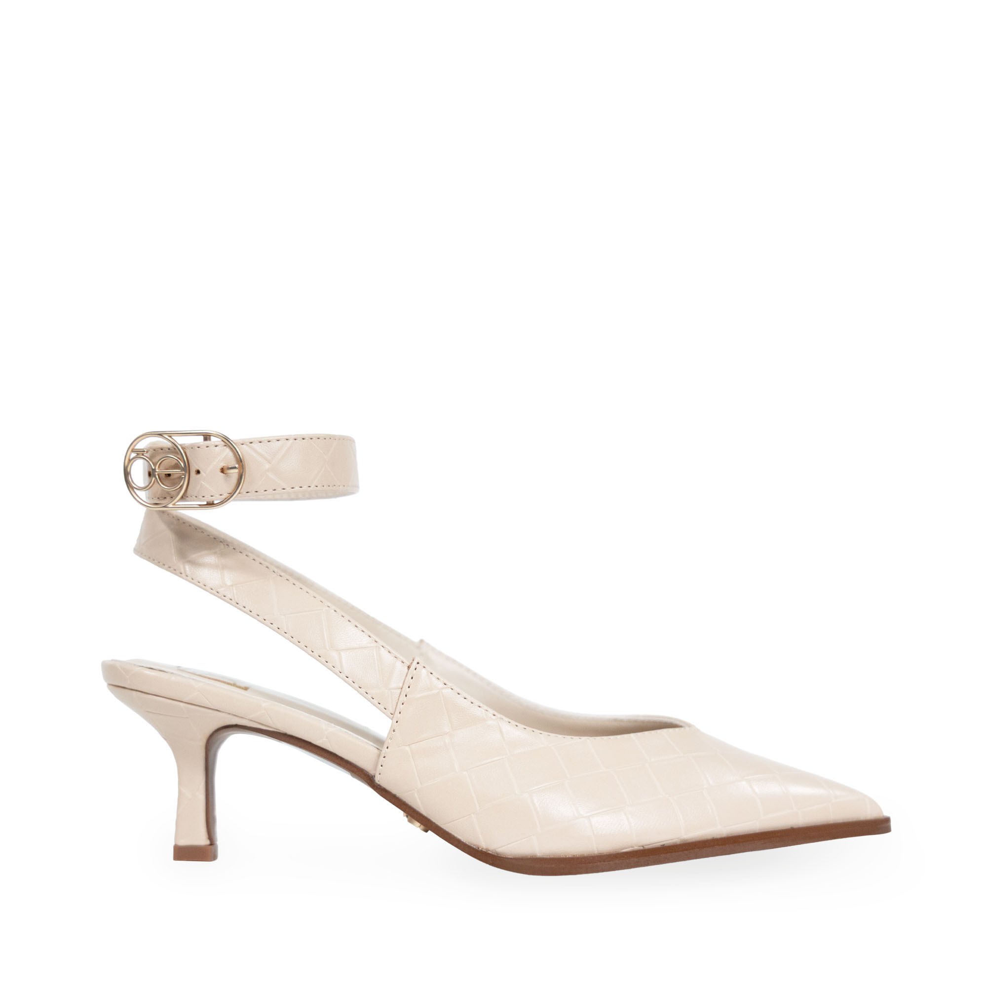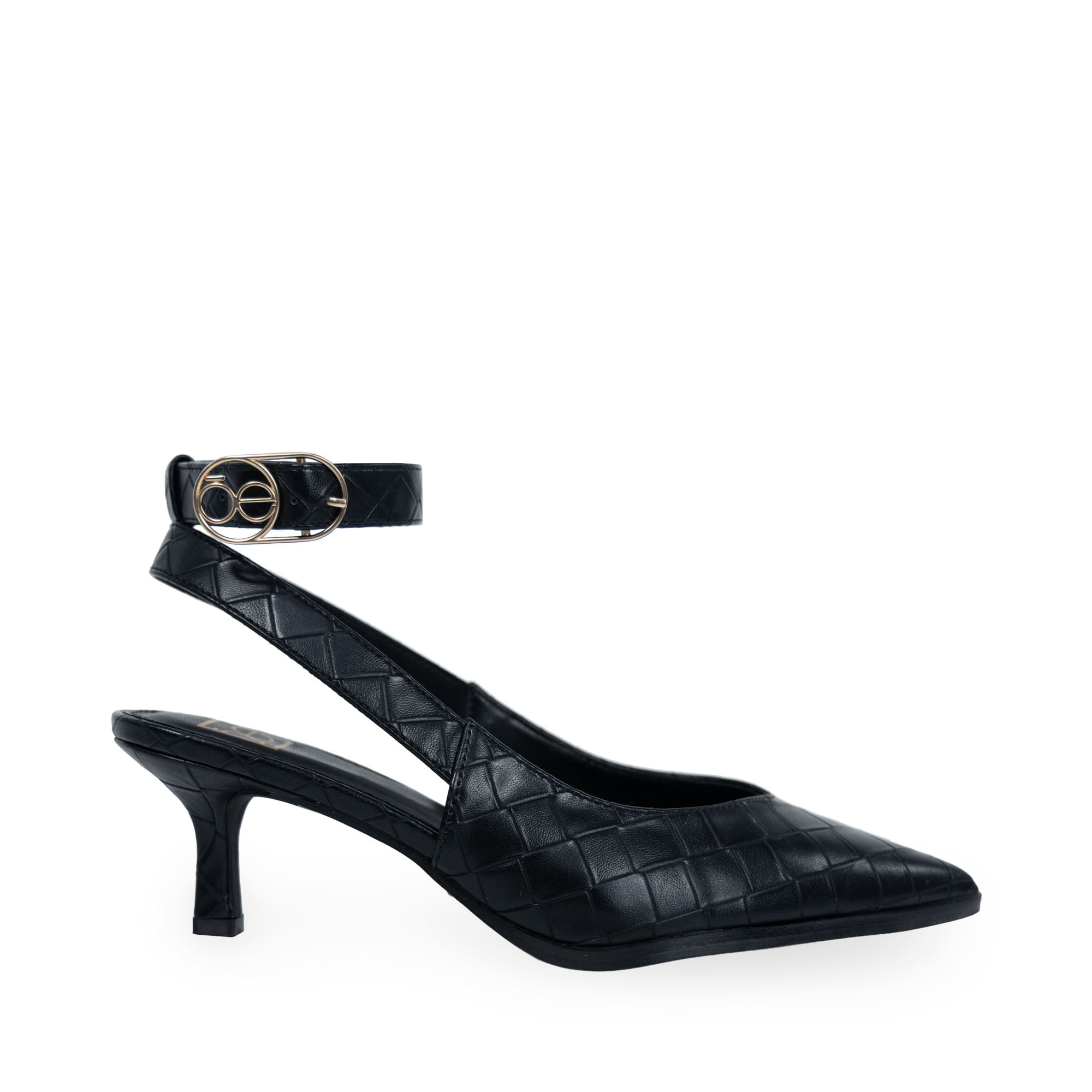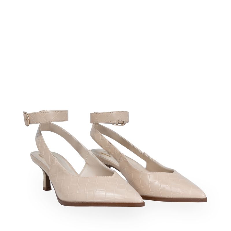 Zapatilla hecha con material vegano apariencia piel look tejido. Cuenta con diseño puntal de alta tendencia. Tiene pulsera ajustable en tobillo. Hebilla metálica con detalle de monograma.