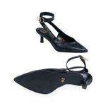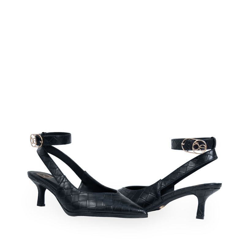 Zapatilla hecha con material vegano apariencia piel look tejido. Cuenta con diseño puntal de alta tendencia. Tiene pulsera ajustable en tobillo. Hebilla metálica con detalle de monograma.